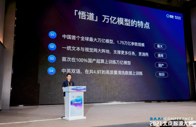 ▲北京智源人工智能研究院學(xué)術(shù)副院長唐杰介紹“悟道2.0”模型的具體情況